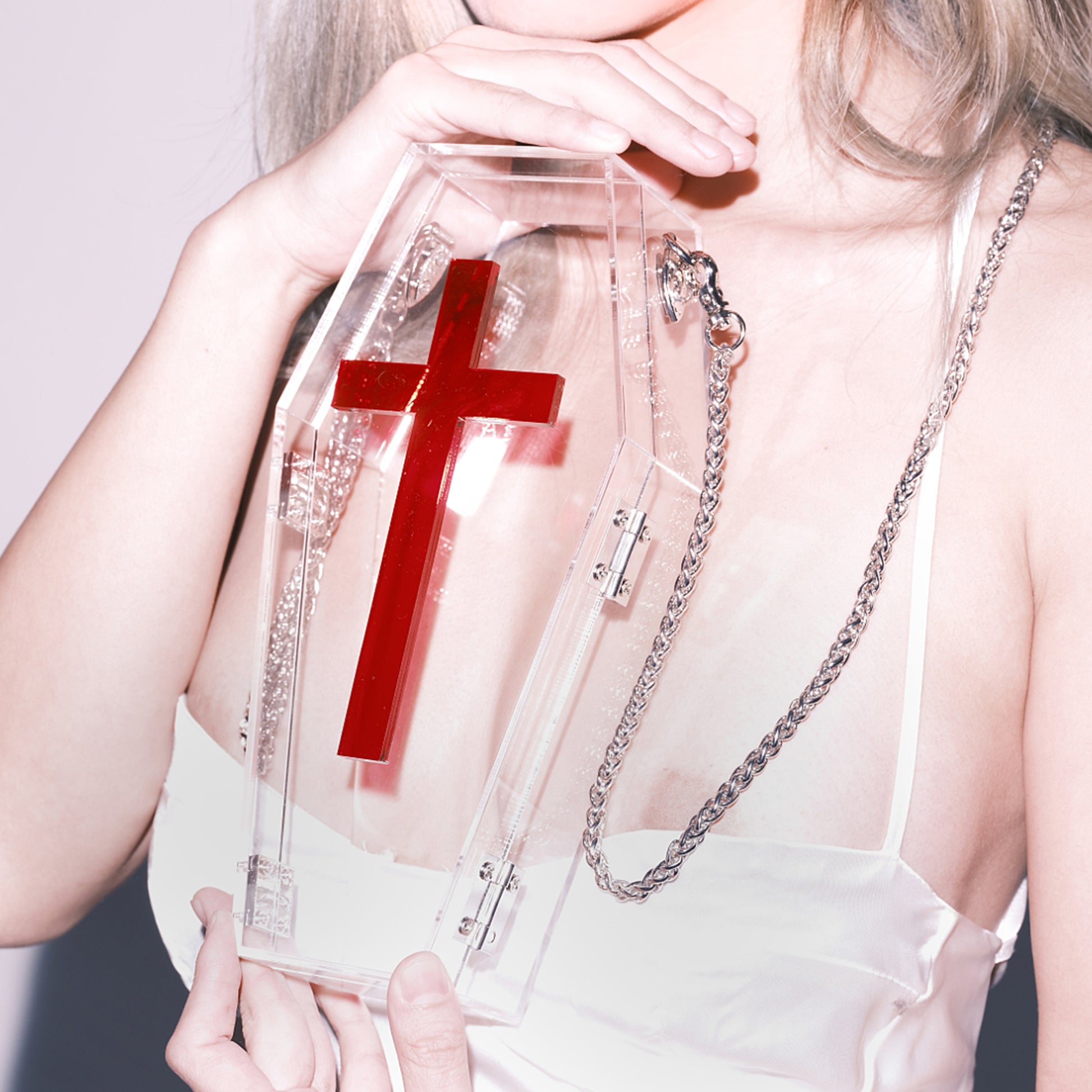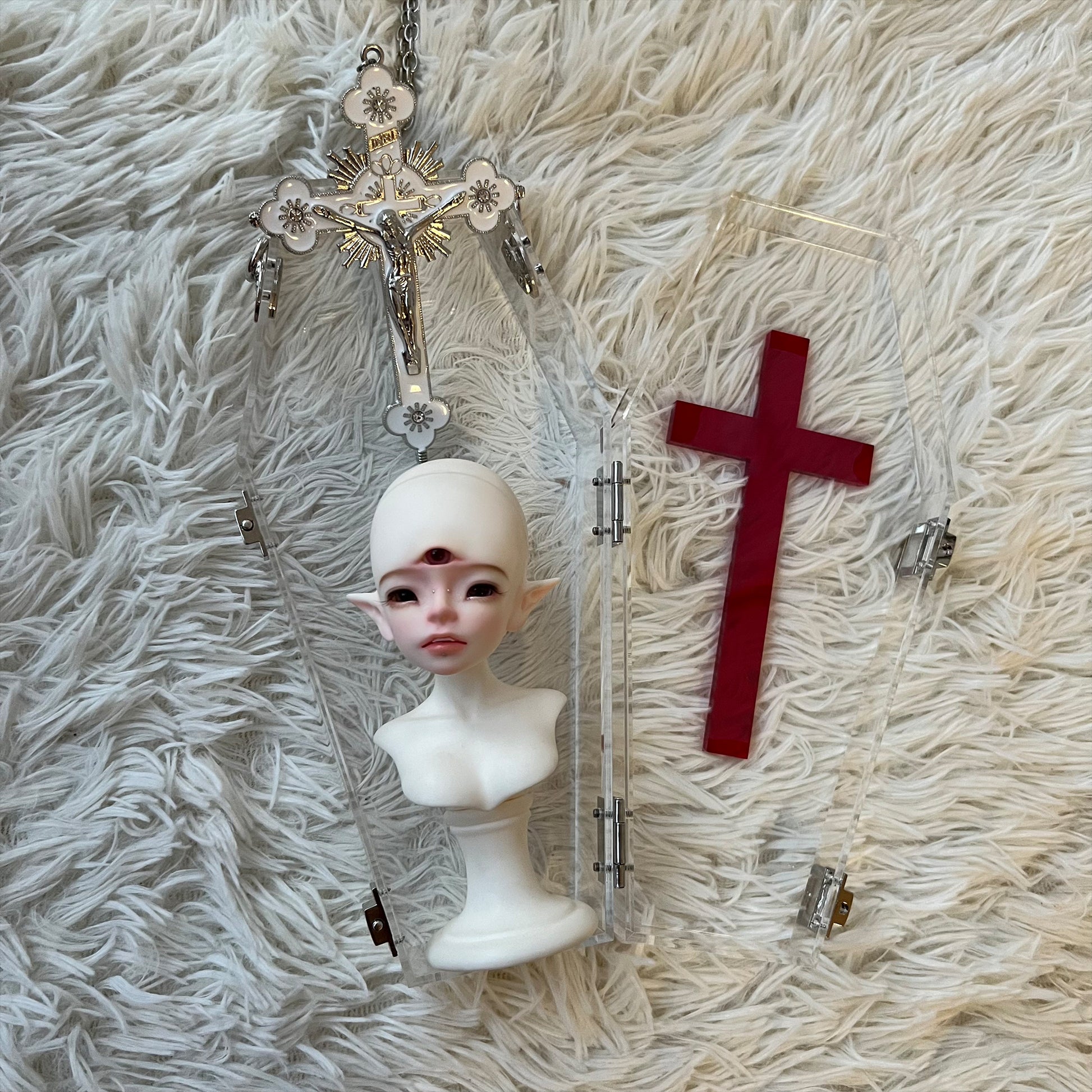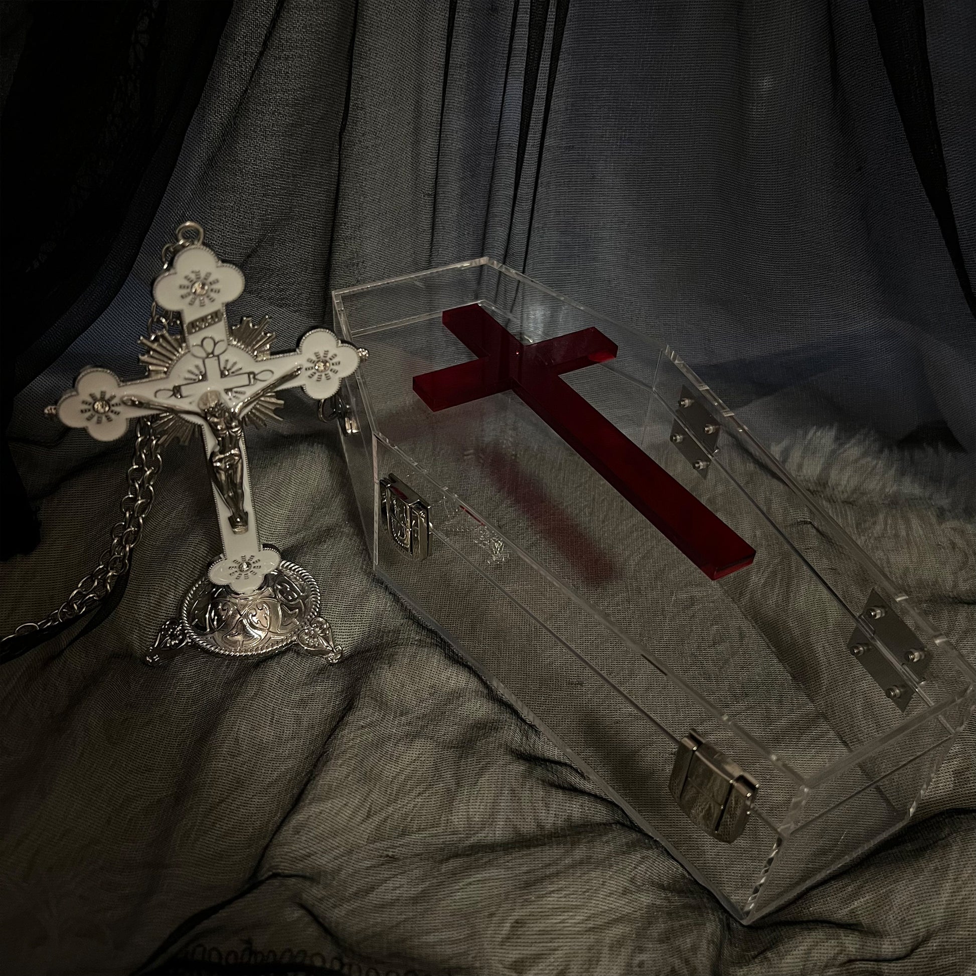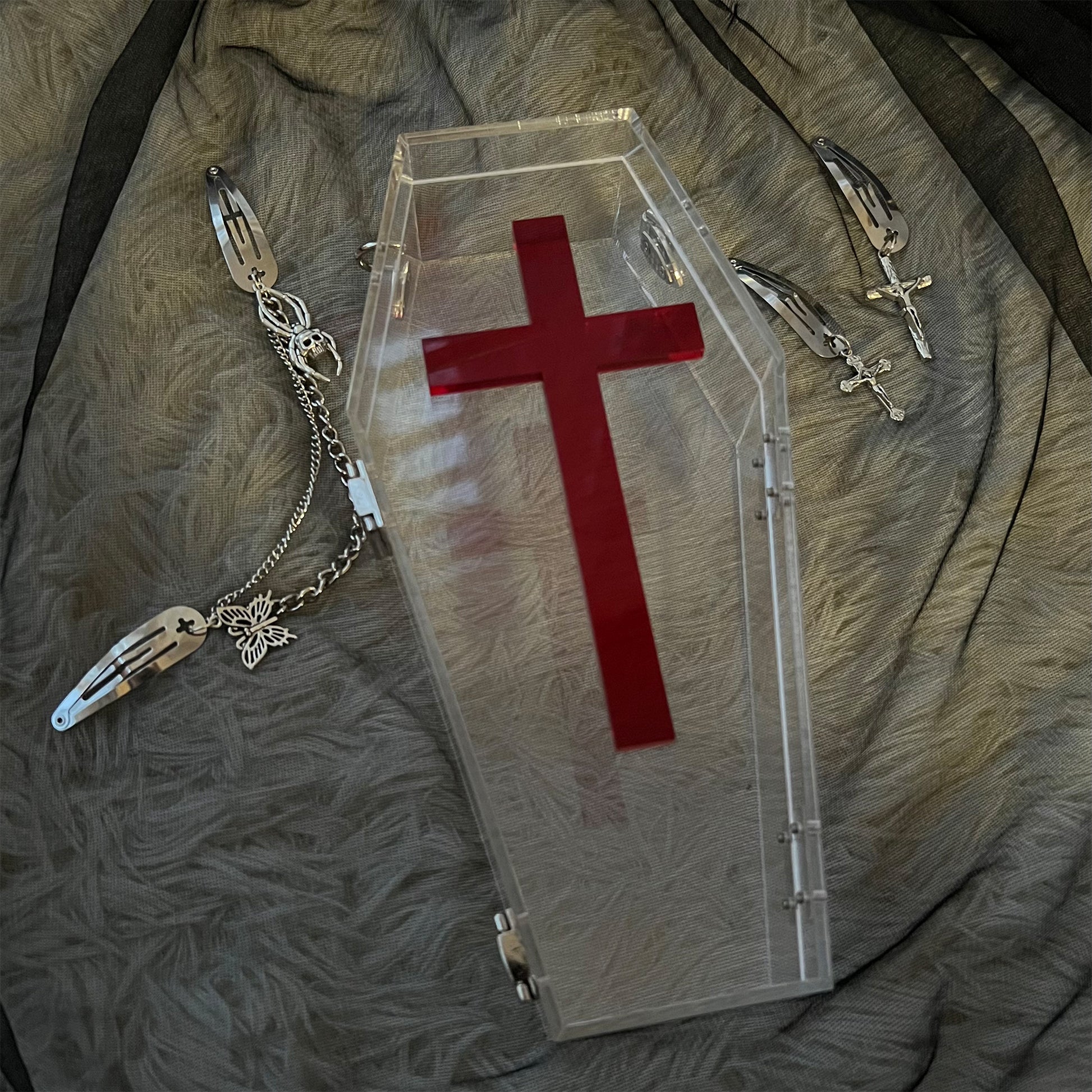 Introducing the Crypt Keeper - Crystal bag, the latest additions to our gothic fashion brand. These coffin-shaped bags are designed to stand out and make a statement, featuring a unique and edgy aesthetic that is perfect for those who love all things gothic.