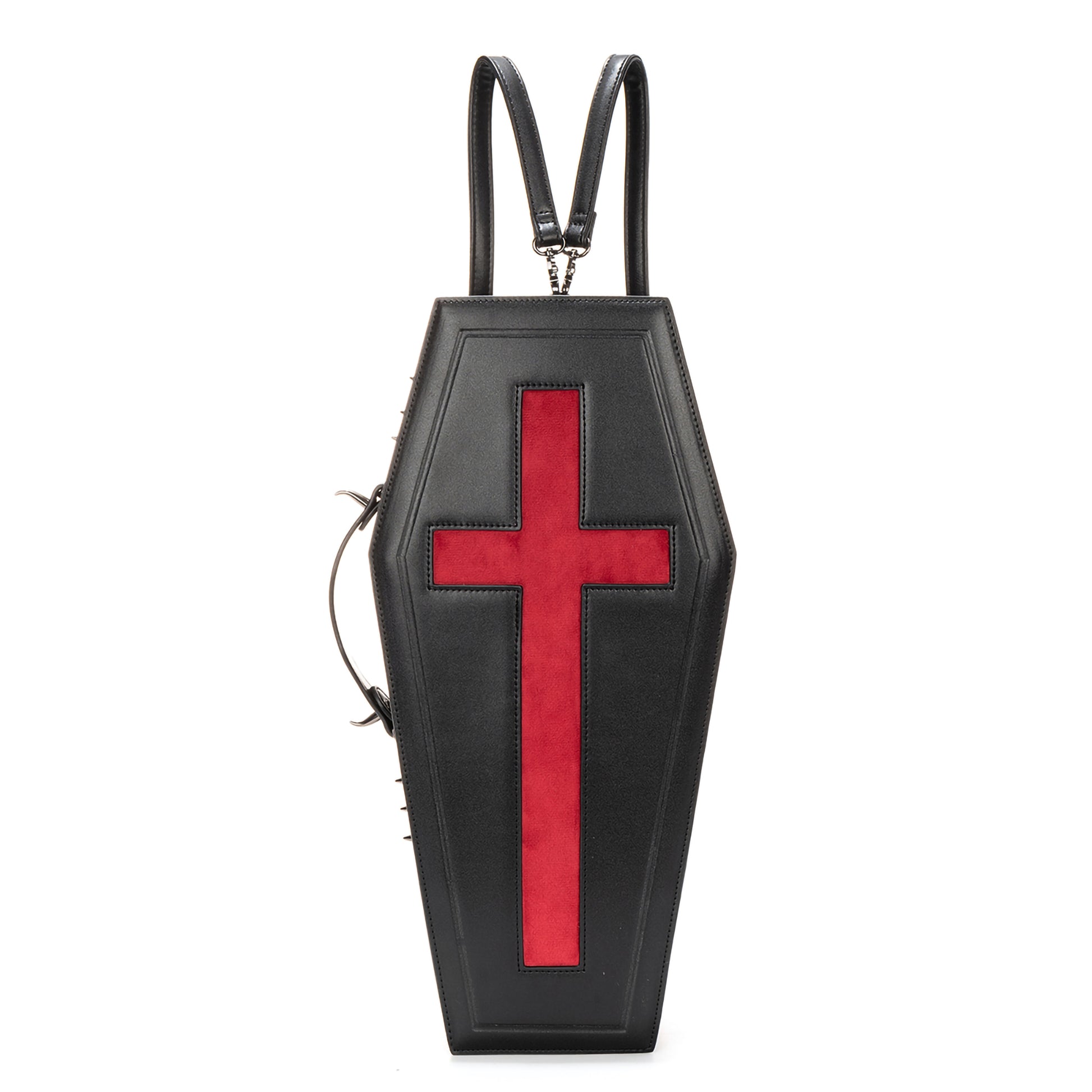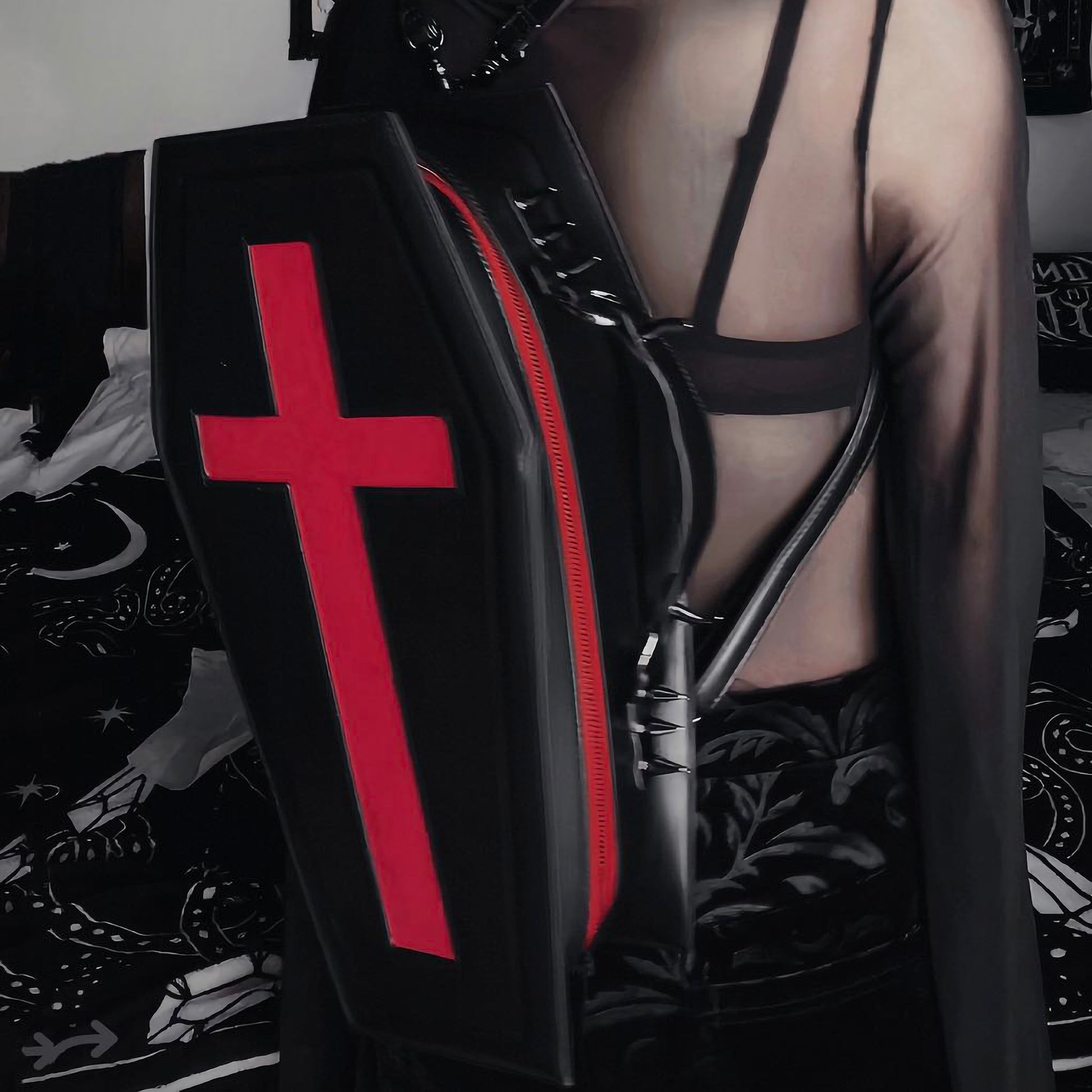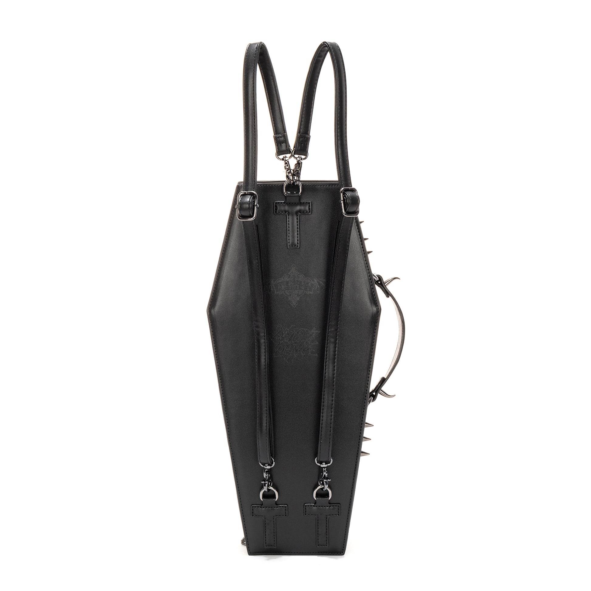 The coffin-shaped design of the Reaper's Rucksack - MorbidMule is inspired by the dark, creepy, and cryptic aspects of gothic fashion.