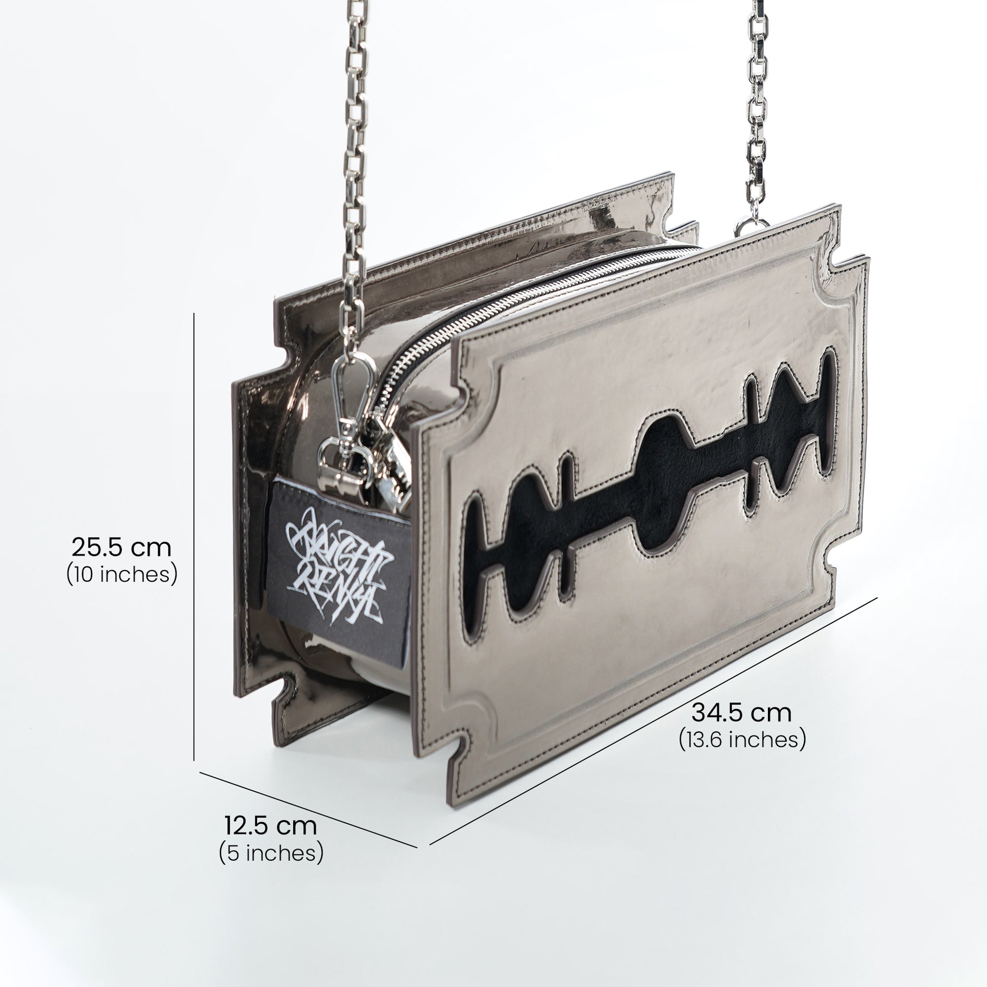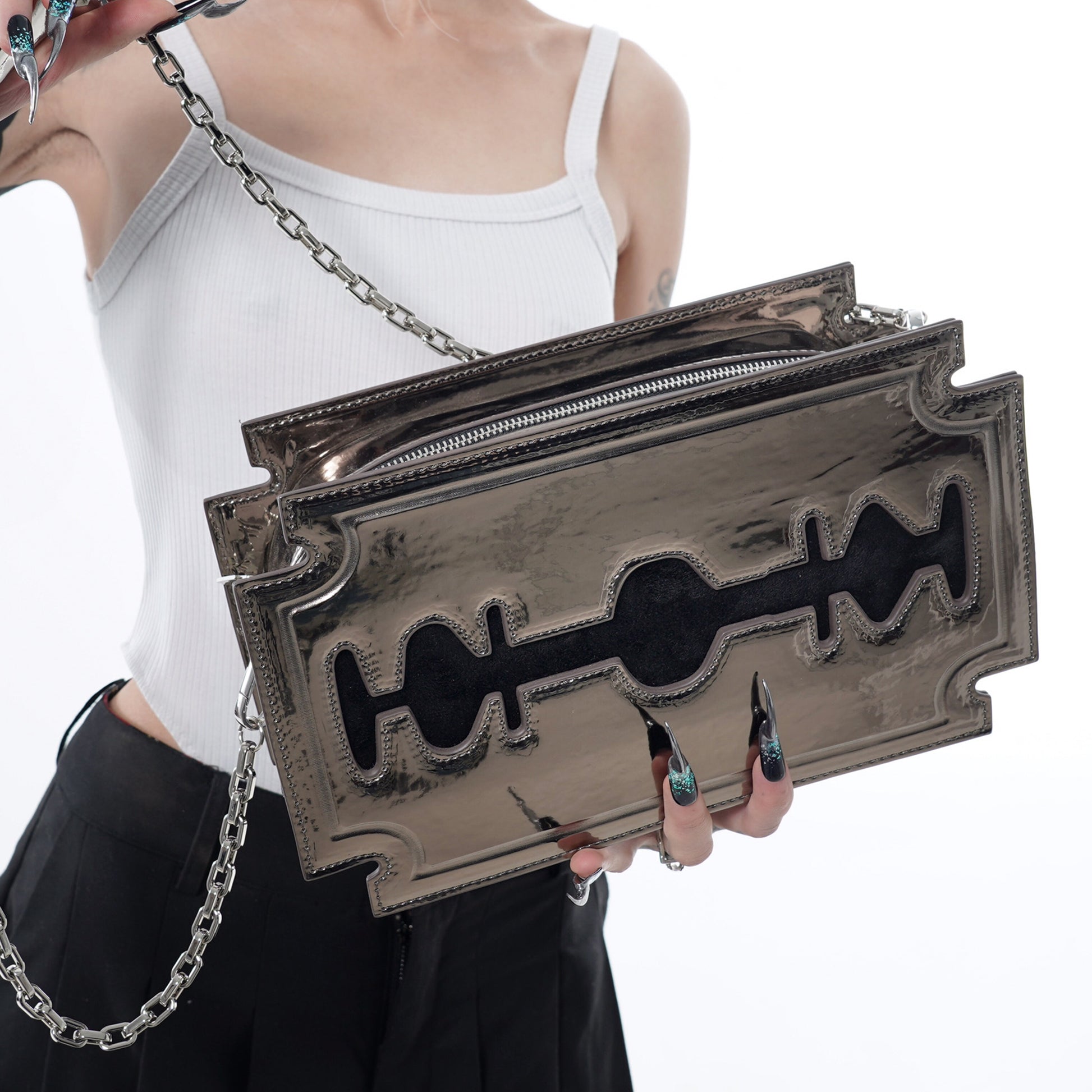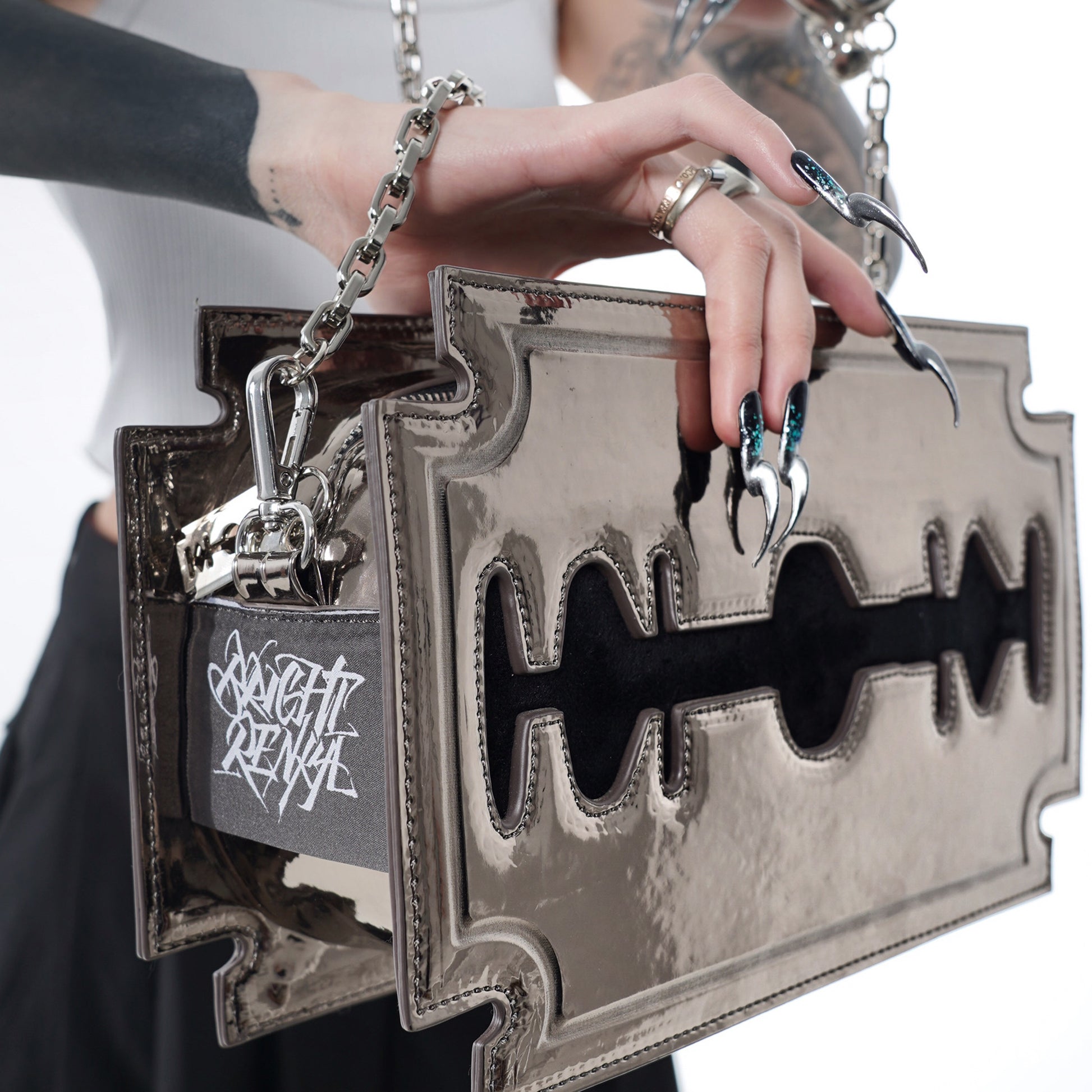 Introducing Blade Beauty Moonlit Silver, a collaboration between talented artists Ling and Renka. This edgy and fashionable bag features an intricate pattern of blades and moonlit silver accents, representing strength, resilience, and the ability to cut through obstacles and challenges. The moonlit silver accents symbolize the beauty and mystery of the night sky, reminding us to embrace the darkness as well as the light.